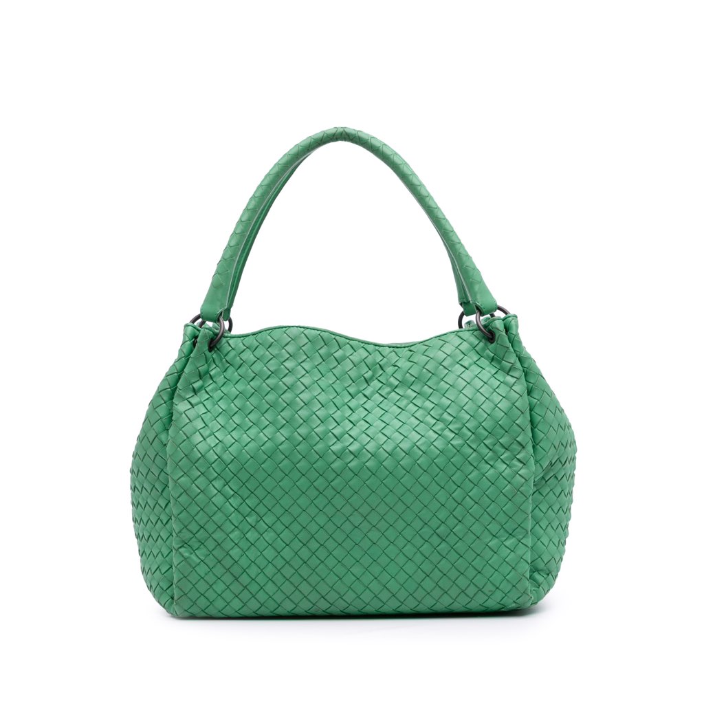This tote bag features a woven leather body, rolled leather handles, an open top, and interior zip and slip pockets.
