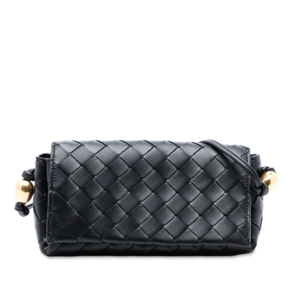 This crossbody features a woven nappa leather body, a flat shoulder strap with attached zip pouches, and a flap with magnetic snap closure.