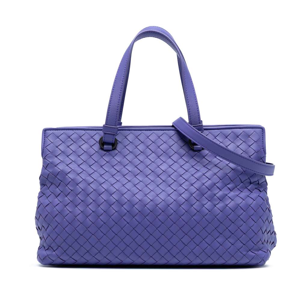 This satchel features a woven nappa leather body, flat leather handles, a detachable flat strap, dual zip compartments, and an interior slip pocket.