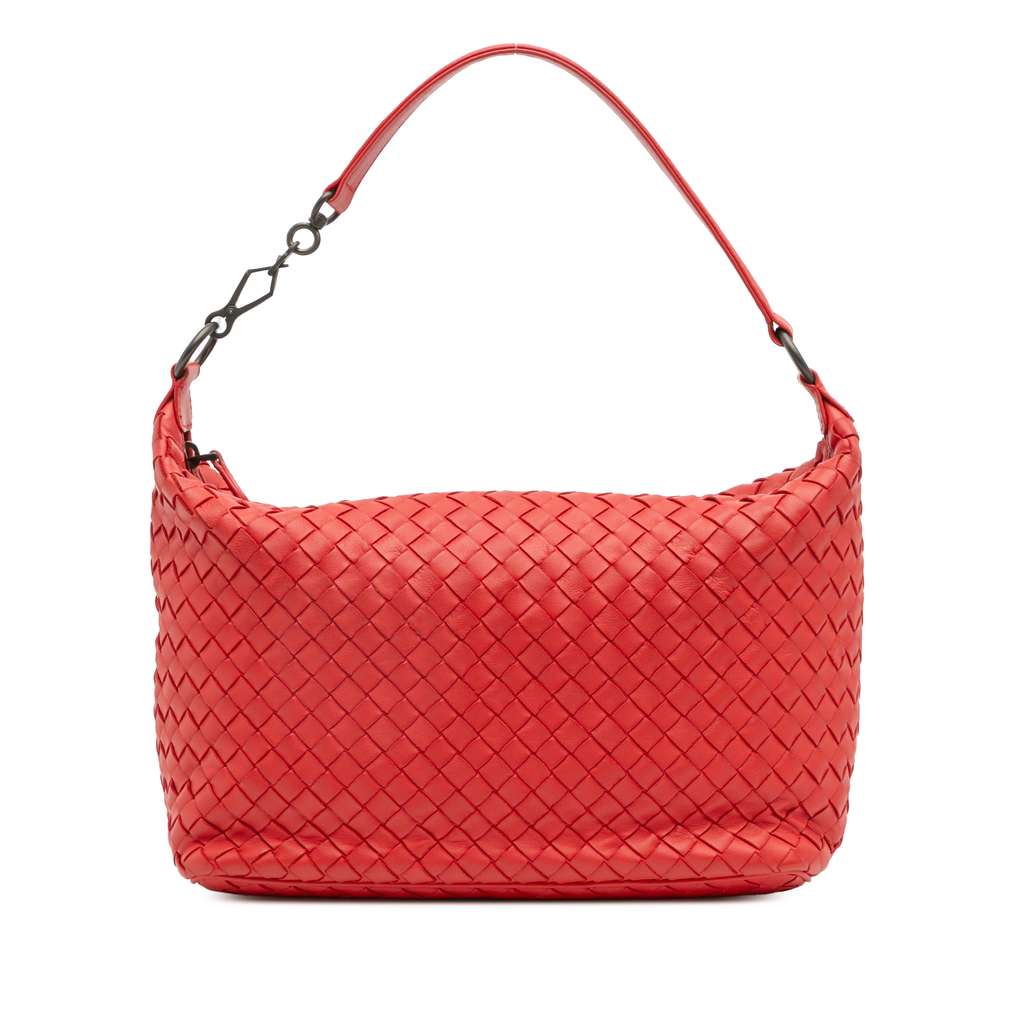 This shoulder bag features a woven nappa leather, a flat strap, and a top zip closure.