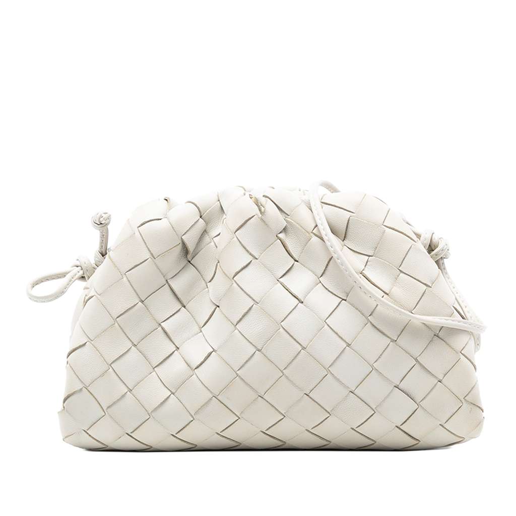 The Mini Pouch features a woven leather body, a flat leather strap, and a top magnetic snap closure.