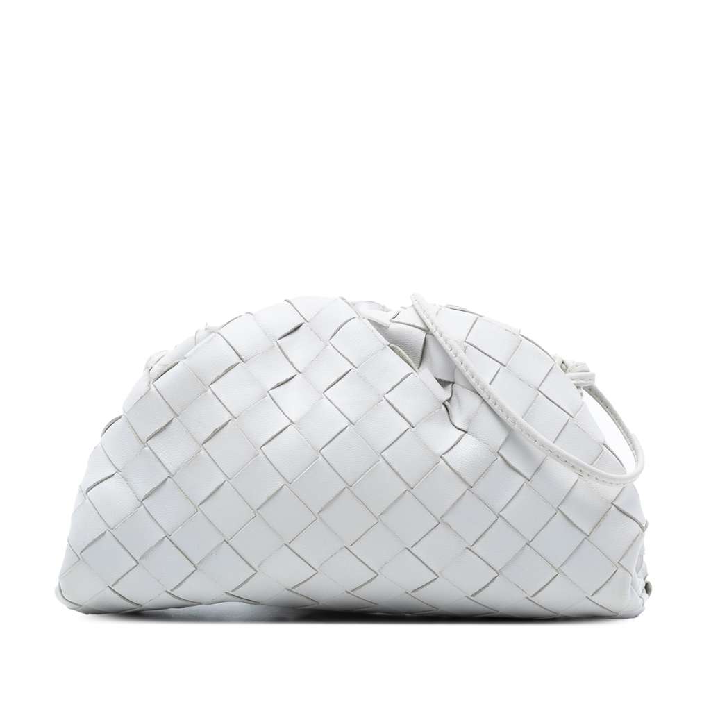 The Mini Pouch features a woven leather body, a flat leather strap, and a top magnetic snap closure.