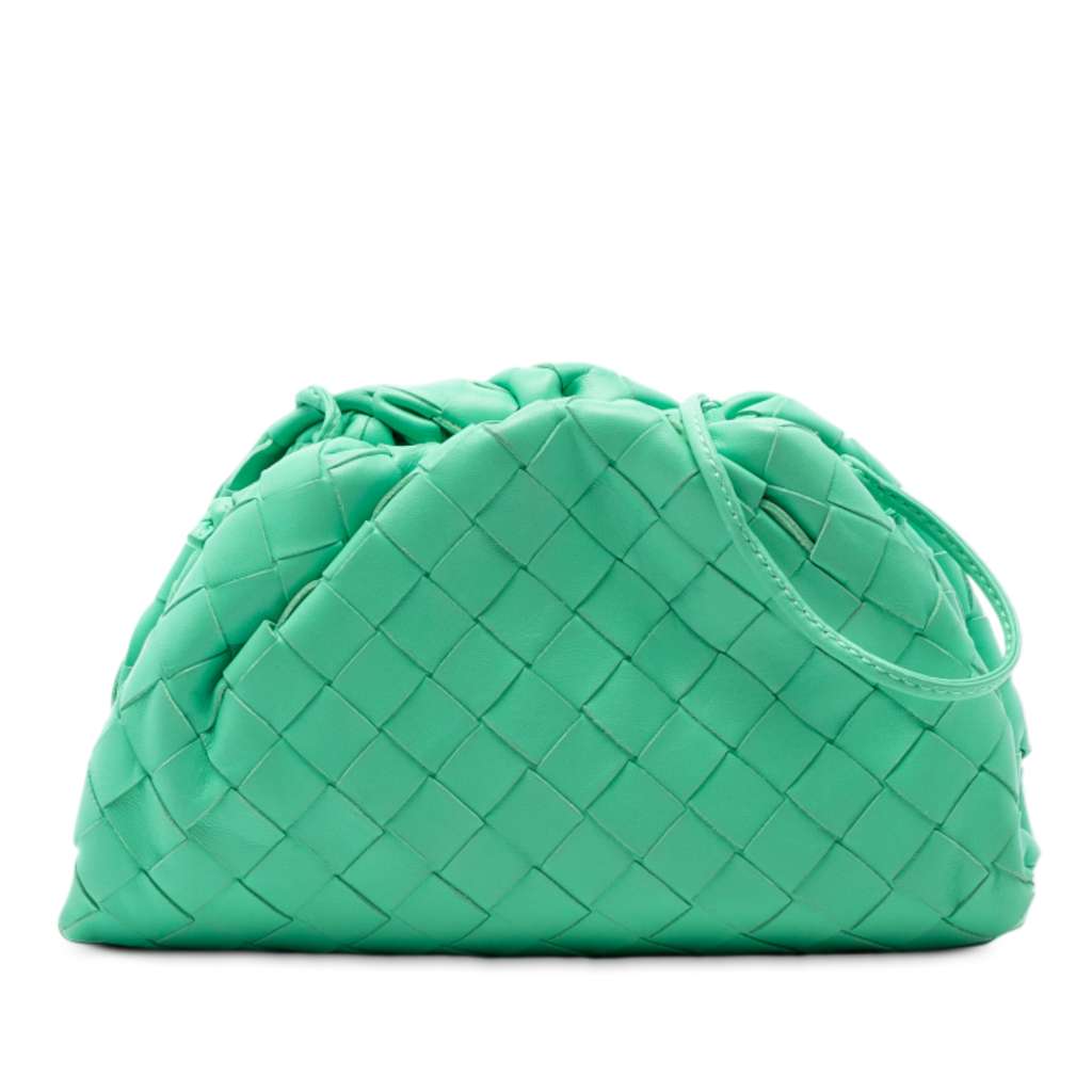 The Pouch features a woven leather body, flat leather strap, and a magnetic closure.