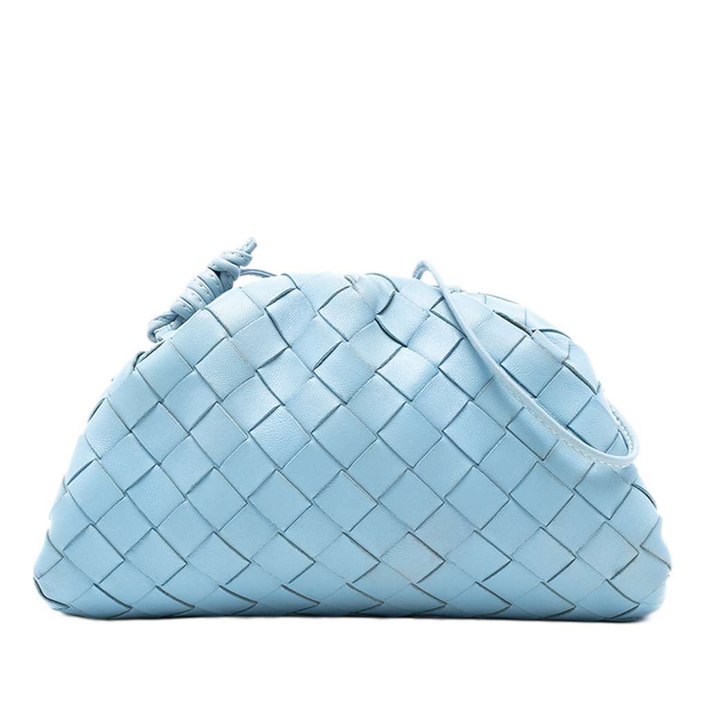 The Pouch features a woven leather body, flat leather strap, and a magnetic closure.