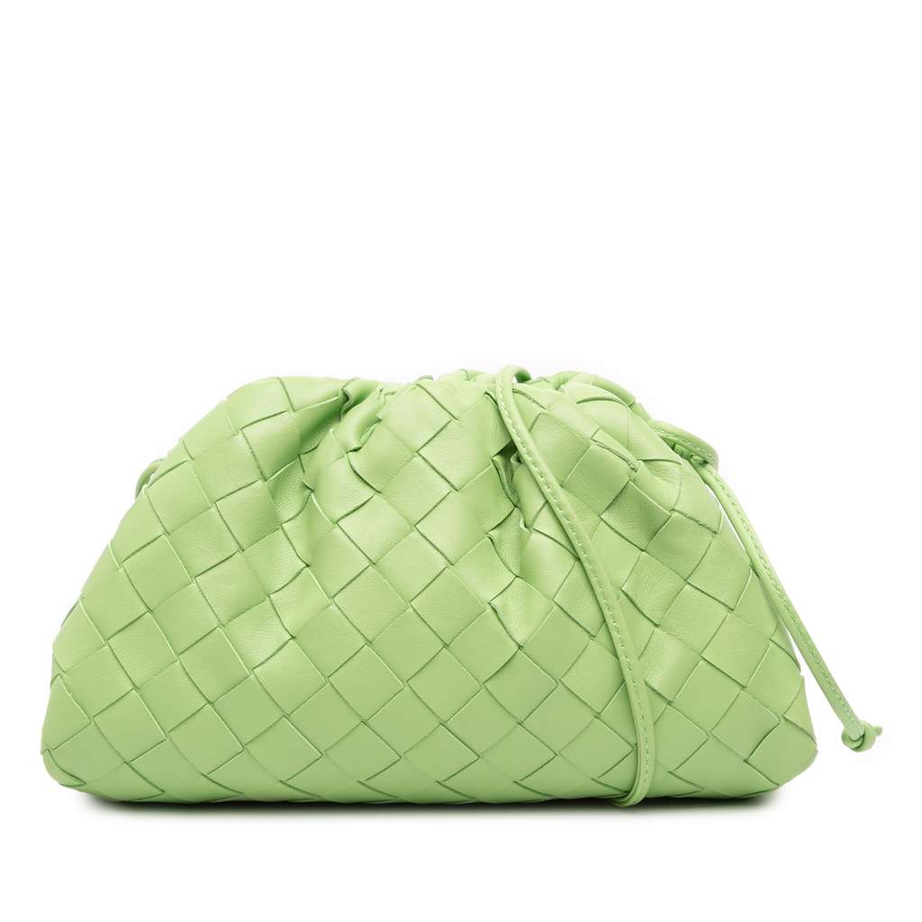 The Pouch features a woven leather body, flat leather strap, and a magnetic closure.