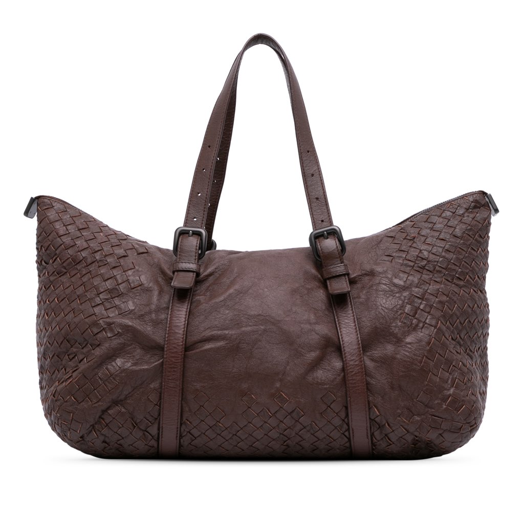 This tote bag features a woven nappa leather body, flat leather straps, a top zip closure, and an interior zip pocket.