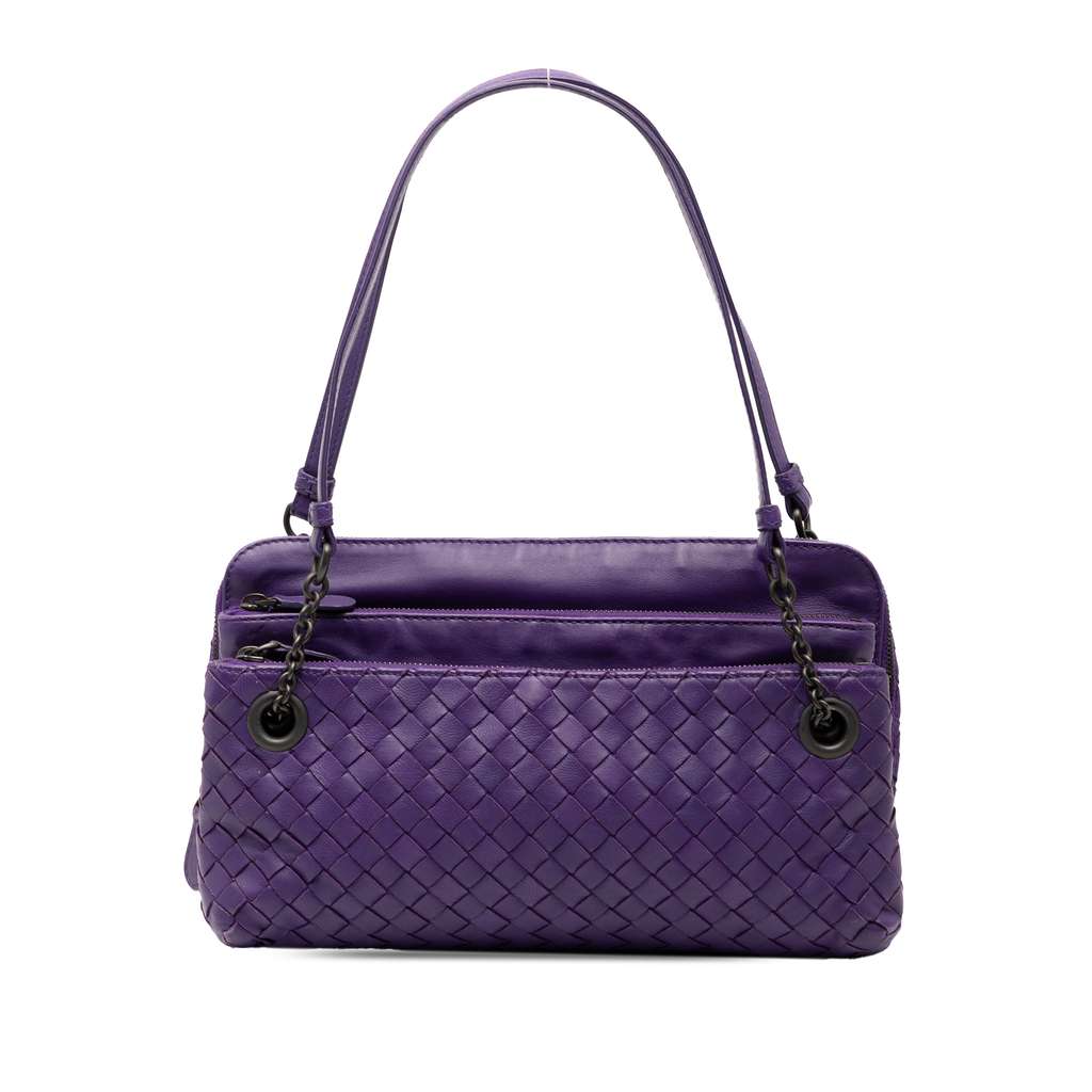 This shoulder bag features a woven leather body, flat leather straps, and triple compartments with top zip closures.