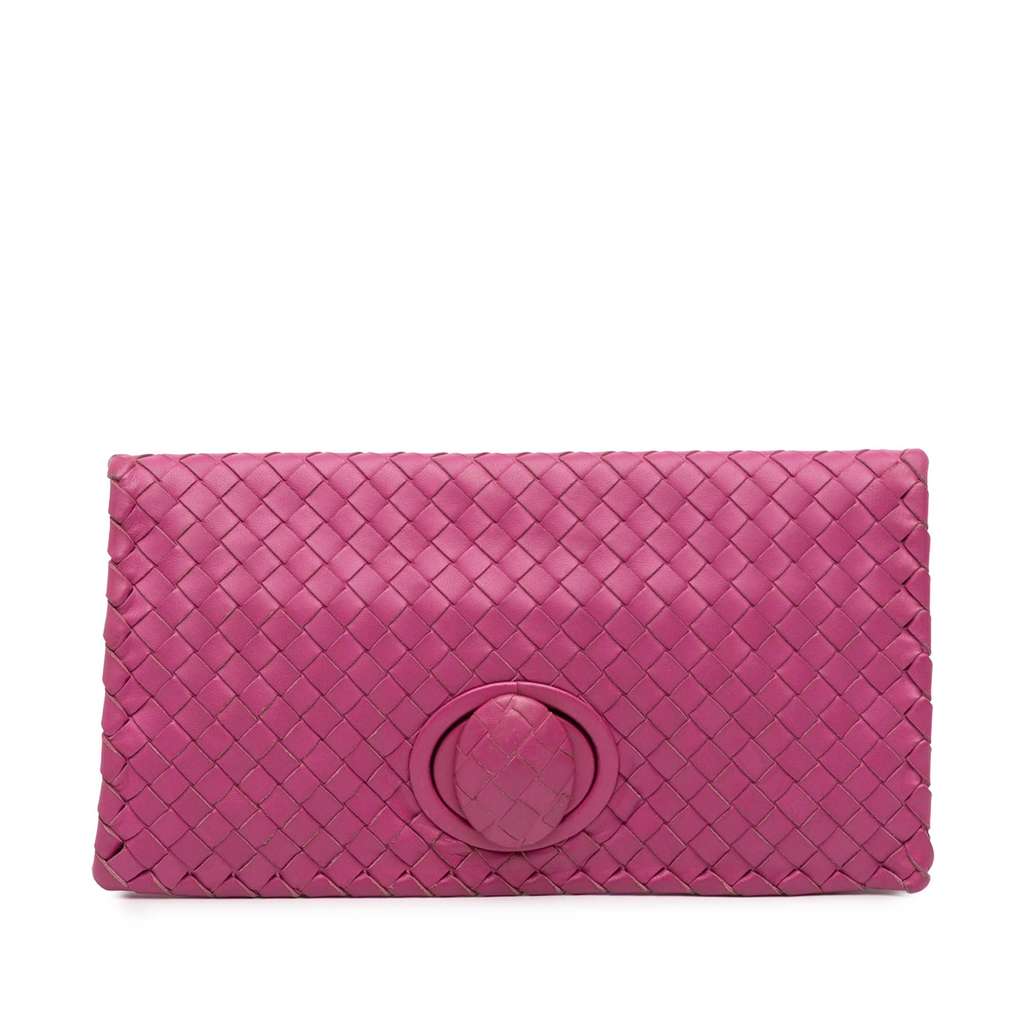 This clutch features a woven leather body, a front flap with a turn lock closure, and an interior zip pocket.