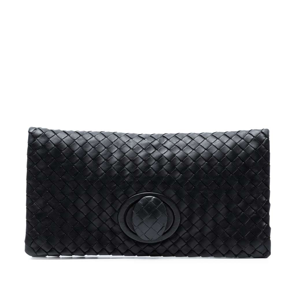 This clutch features a woven leather body, a front flap with a turn lock closure, and an interior zip pocket.
