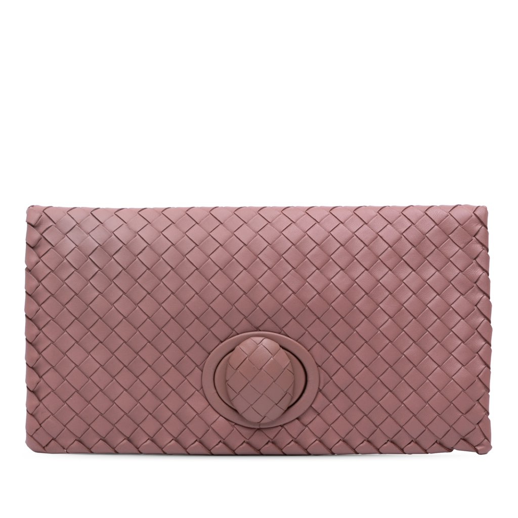 This clutch features a woven nappa leather body, a front flap with a turn lock closure, and an interior zip pocket.