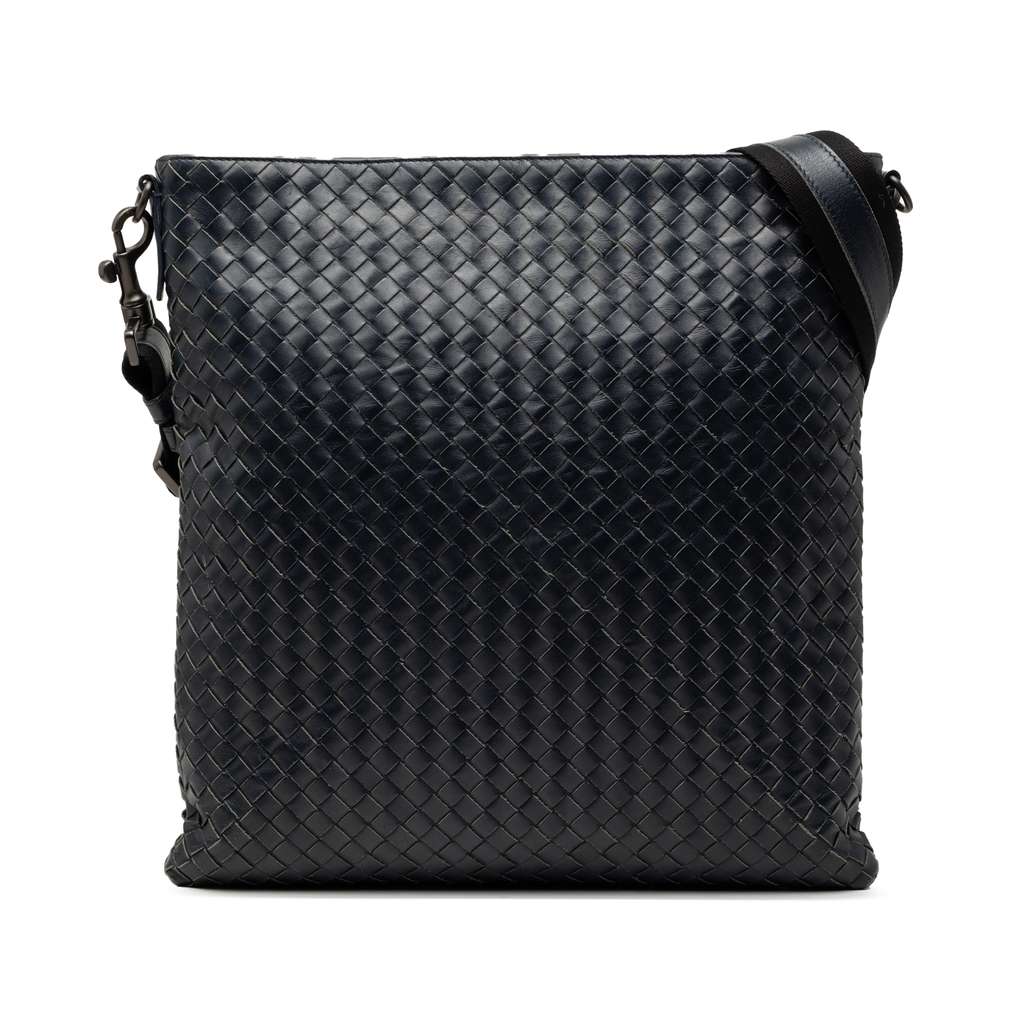 This crossbody bag features a woven nappa leather body, an adjustable flat strap, a top zip closure, and an interior slip pocket.