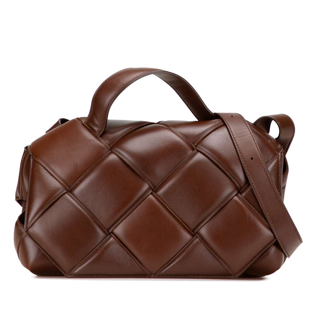 This satchel features a padded woven leather body, a flat leather top handle, an adjustable flat leather shoulder strap, a front flap with magnetic snap closure, and an interior zip pocket.