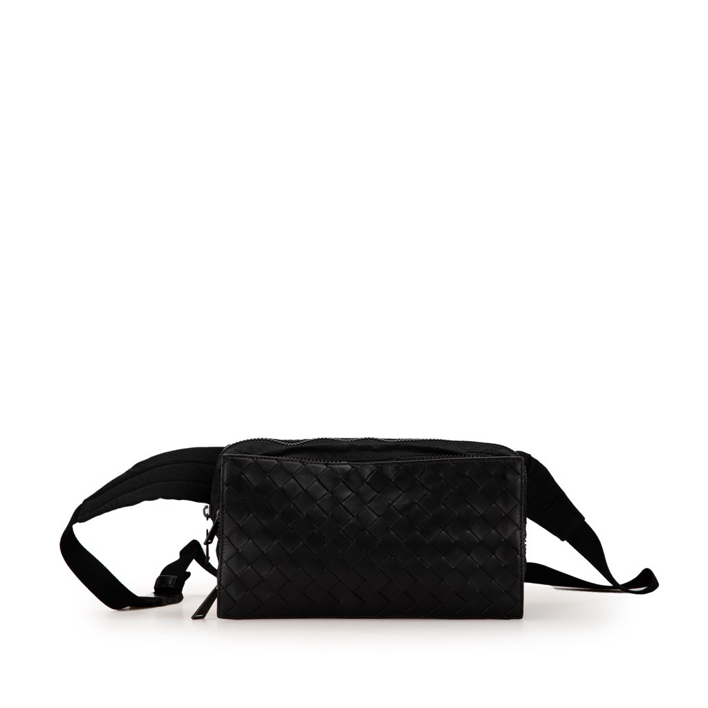 This belt bag features a nylon body, an adjustable waist strap, double zip compartments, and a woven leather front pocket.