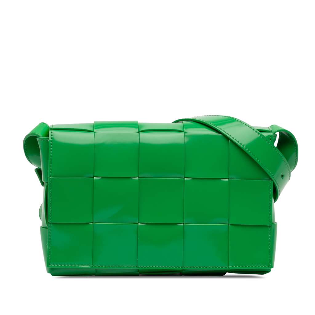 Bottega Veneta Patent Intrecciato Cassette Crossbody Green S