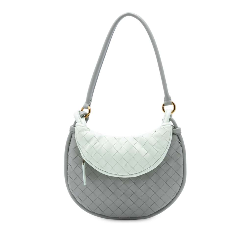 The Gemelli features a woven lambskin leather body, a rolled shoulder strap, a top zip closure, and a removable exterior pouch.