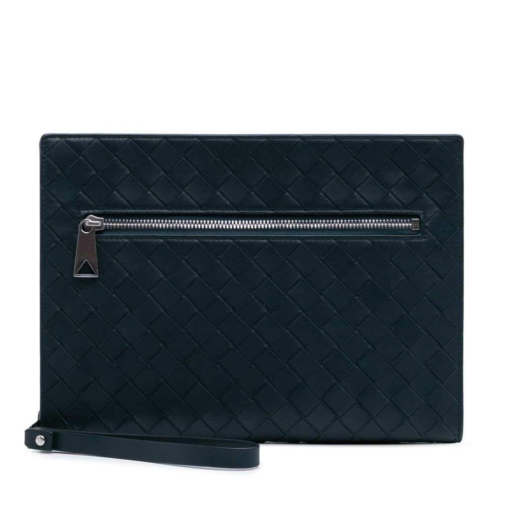 This clutch features a woven leather body, a flat leather wrist strap, a zip around closure, an exterior zip pocket, and interior slip pockets.