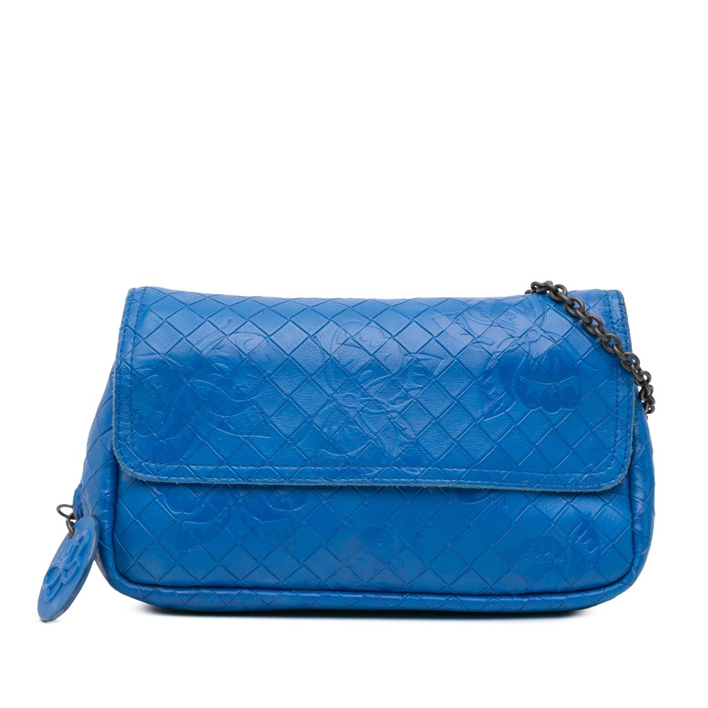 This crossbody bag features an embossed leather body, a detachable chain link shoulder strap, a front flap with button snap closure, and an exterior bottom zip compartment.