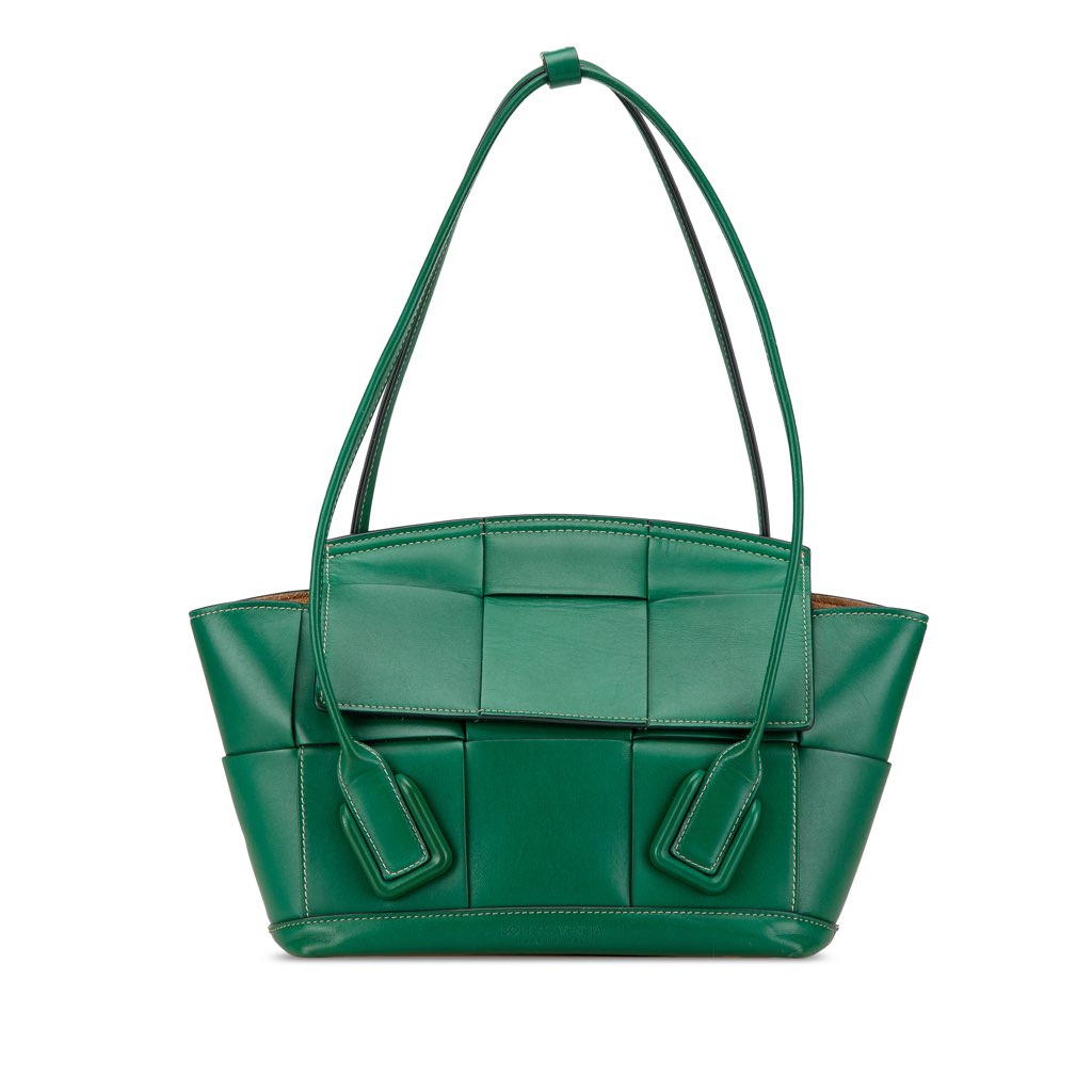 The Arco features a leather body, rolled leather handles, a top flap, and an interior zip pocket.