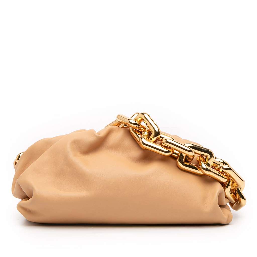 The Chain Pouch features a leather body, a gold-tone chain link strap, and a top magnetic frame closure.