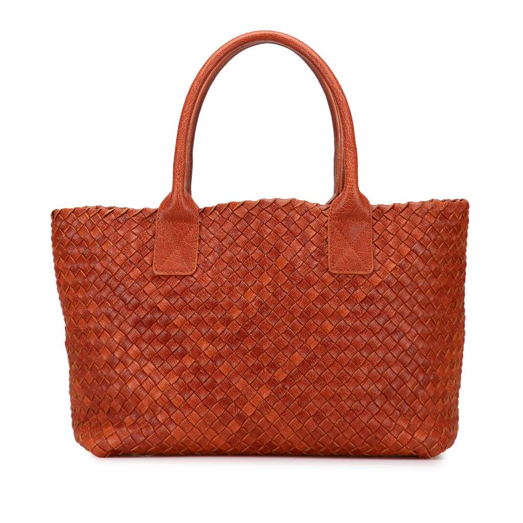 This tote features a woven lambskin leather body, rolled handles, an open top, and a pouch inclusion.