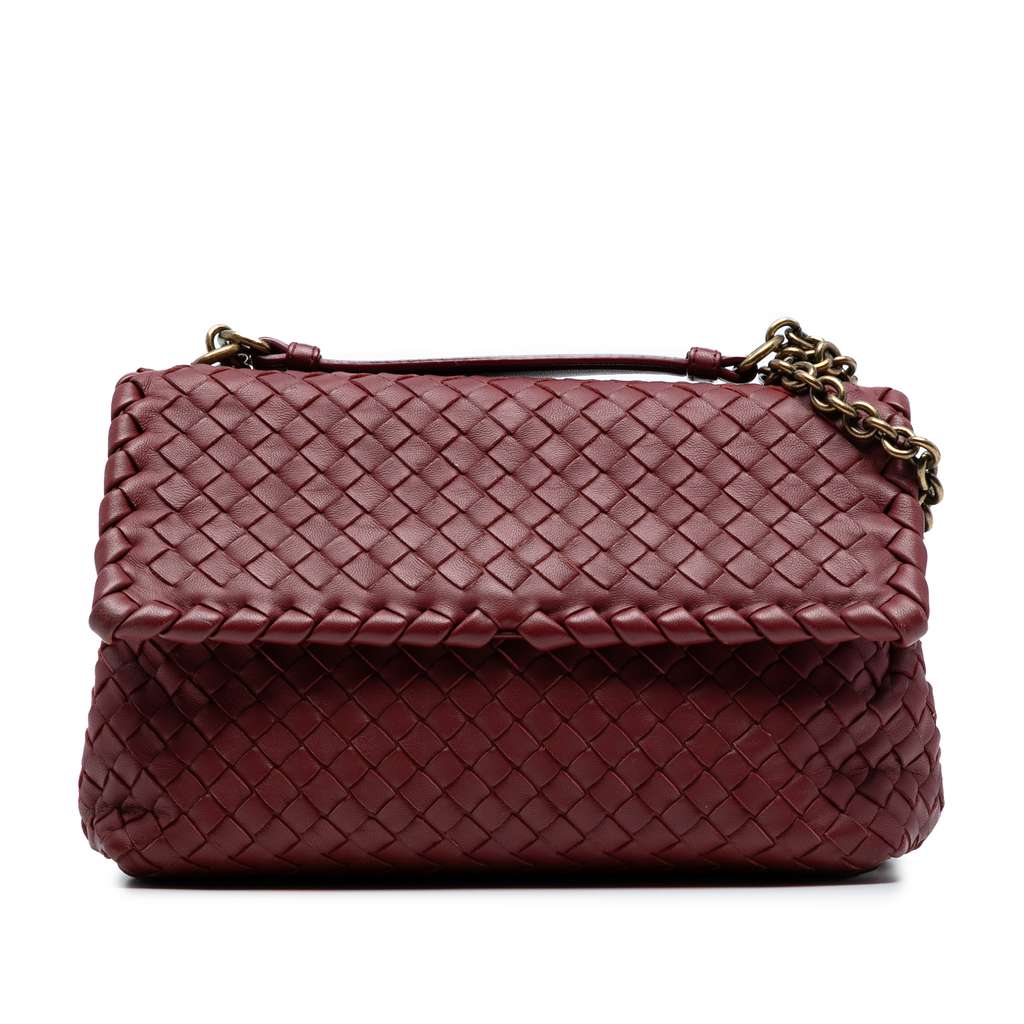 The Olimpia bag features a woven leather body, chain link straps with leather shoulder guard, a front flap with magnetic closure, and interior zip and slip pockets.