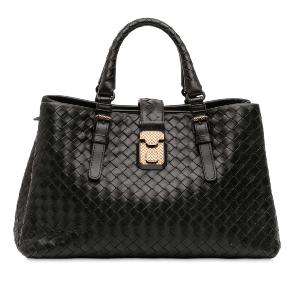 The Small Roma satchel features a woven nappa leather body, rolled leather handles, a top strap with a push lock and magnetic closure, interior compartments, and an interior zip pocket.