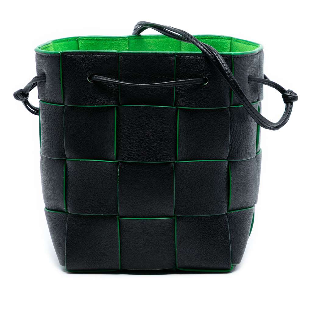 This bucket bag features a woven nappa leather body, a flat leather shoulder strap, and an open top with a drawstring closure.