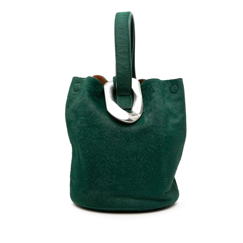 The Drop bucket bag features a pony hair body, a flat strap, an open top with magnetic snap closures, and an interior slip pocket.