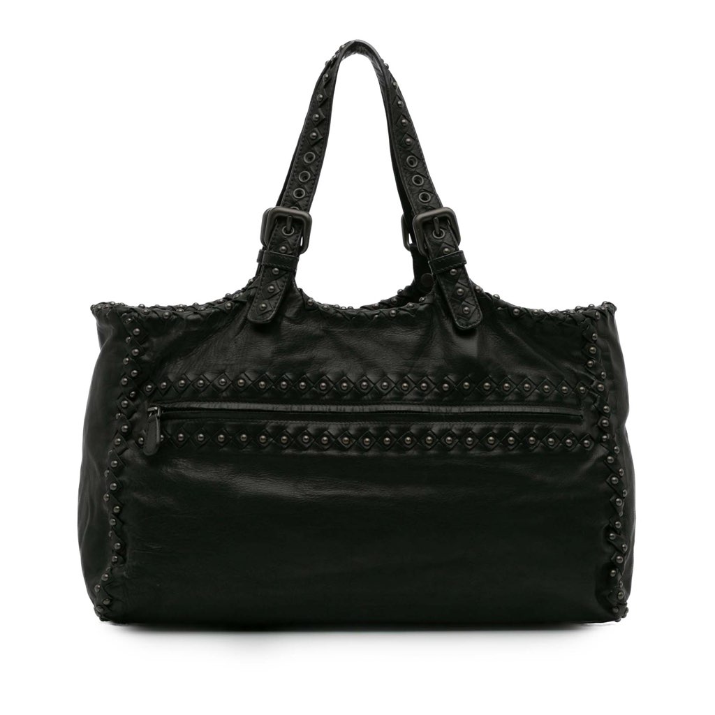 This tote bag features a studded leather body, flat leather handles, an open top, an exterior zip pocket, and interior zip and slip pockets.