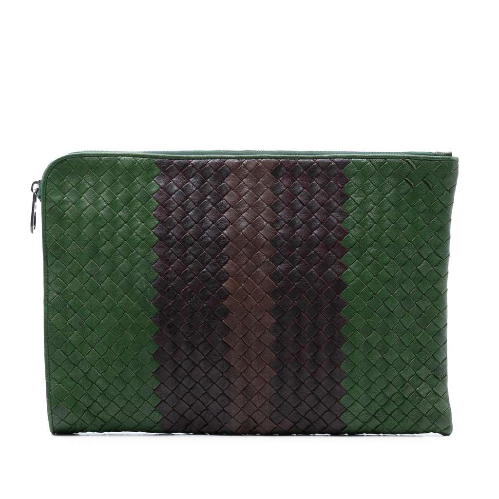 This clutch features a woven leather body, a top zip closure, and interior slip pockets.
