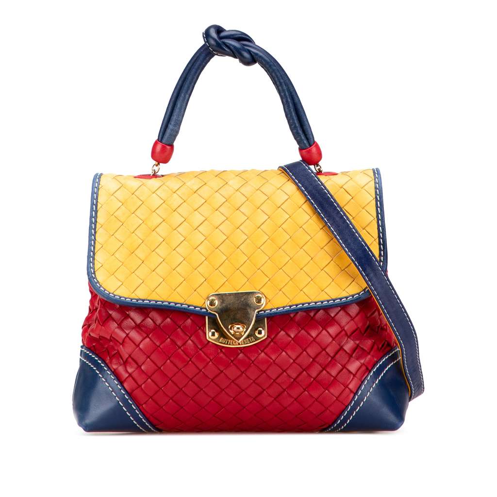 This satchel bag features a woven leather body, a knotted leather top handle, a detachable flat leather shoulder strap, a front flap with turn lock closure, interior open compartments, and an interior zip pocket.