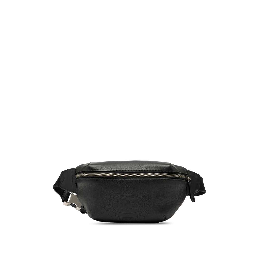 This belt bag features an embossed leather body, an adjustable flat waist strap, a top zip closure, an exterior back zip pocket, and an interior slip pocket.