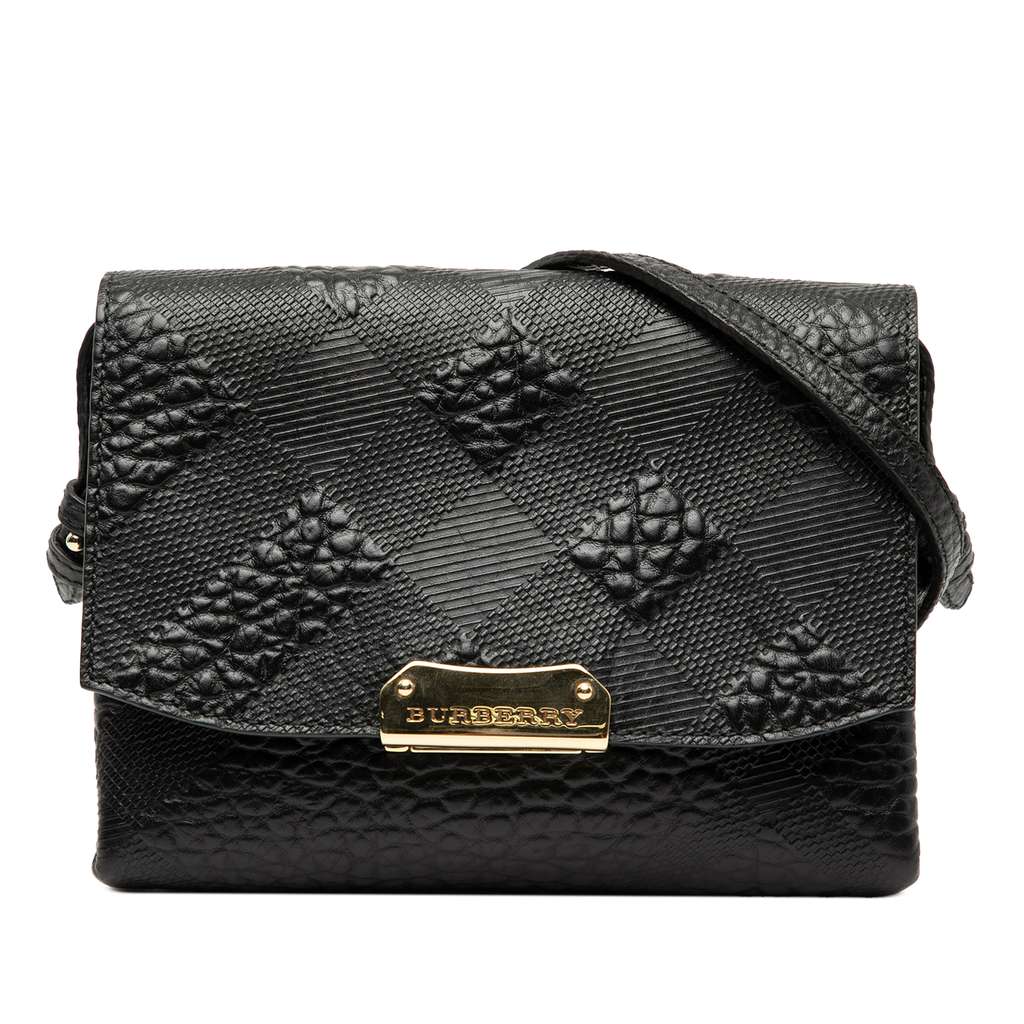 This crossbody bag features an embossed leather body, a flat leather strap, a front flap with magnetic snap closure, and interior slip pockets.