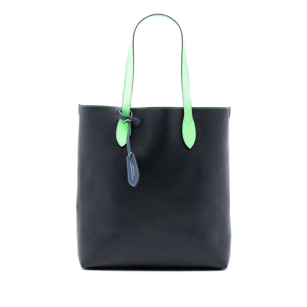 This tote features a reversible leather and coated canvas body, flat leather straps, an open top, and an interior zip pocket.