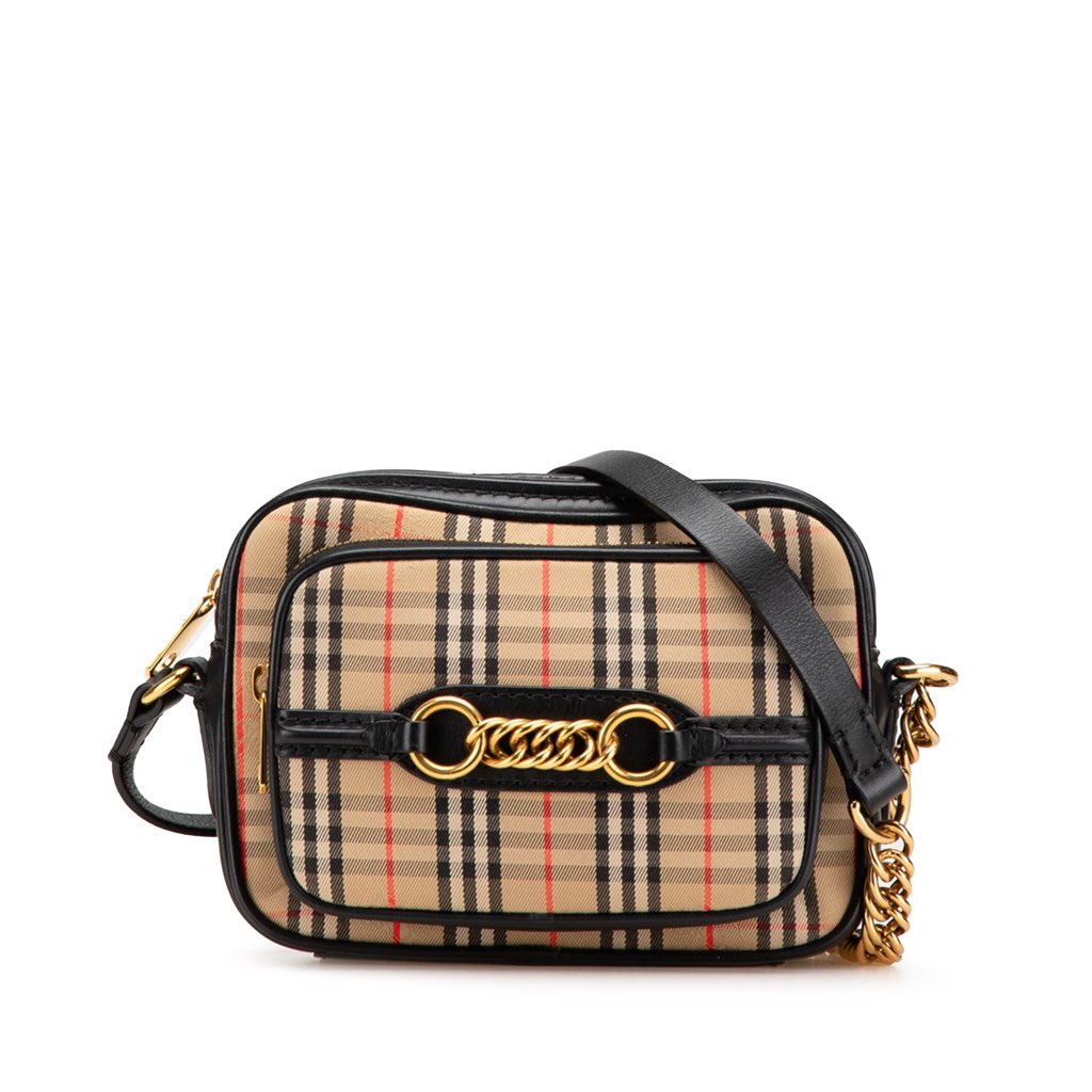 This crossbody bag features a haymarket check canvas body with leather trim, a leather and chain link shoulder strap, a top zip closure, an exterior front zip pocket, and an interior slip pocket.