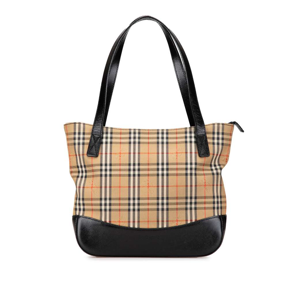 This handbag features a canvas body with leather trim, flat leather handles, a top zip closure, and an interior zip pocket.