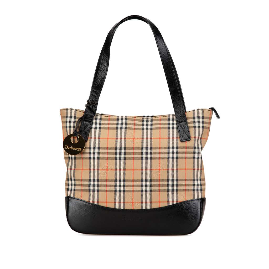 This handbag features a Haymarket Check canvas body with a leather bottom, flat leather straps, a top zip closure, and interior zip and slip pockets.