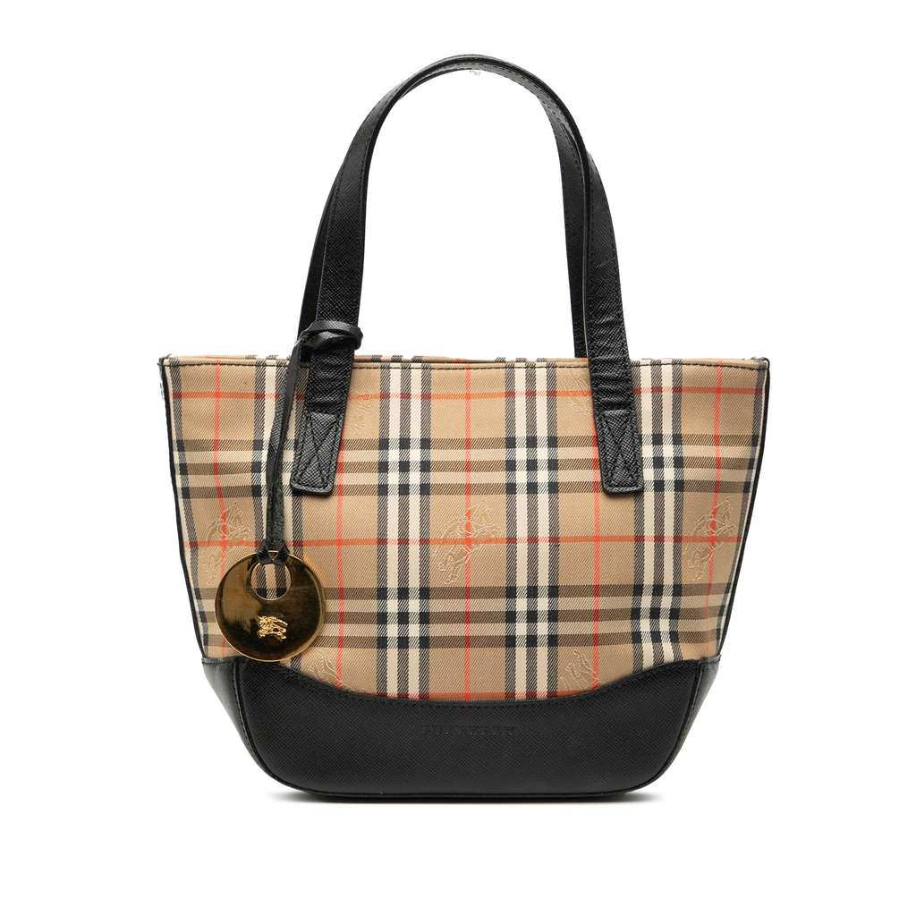 This handbag features a haymarket check canvas body with leather bottom, flat leather straps, a top zip closure, an exterior slip pocket, and interior zip and slip pockets.