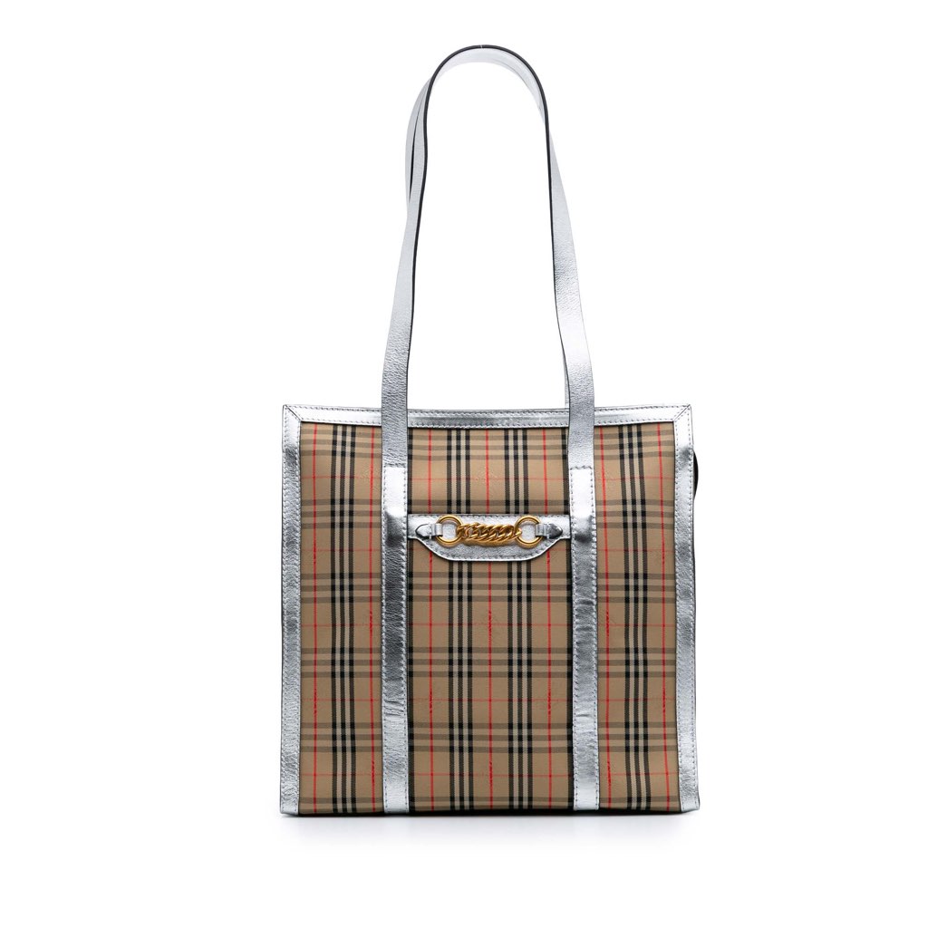This tote bag features a haymarket check canvas body with leather trim, flat leather straps, a top zip closure, and an interior zip pocket.