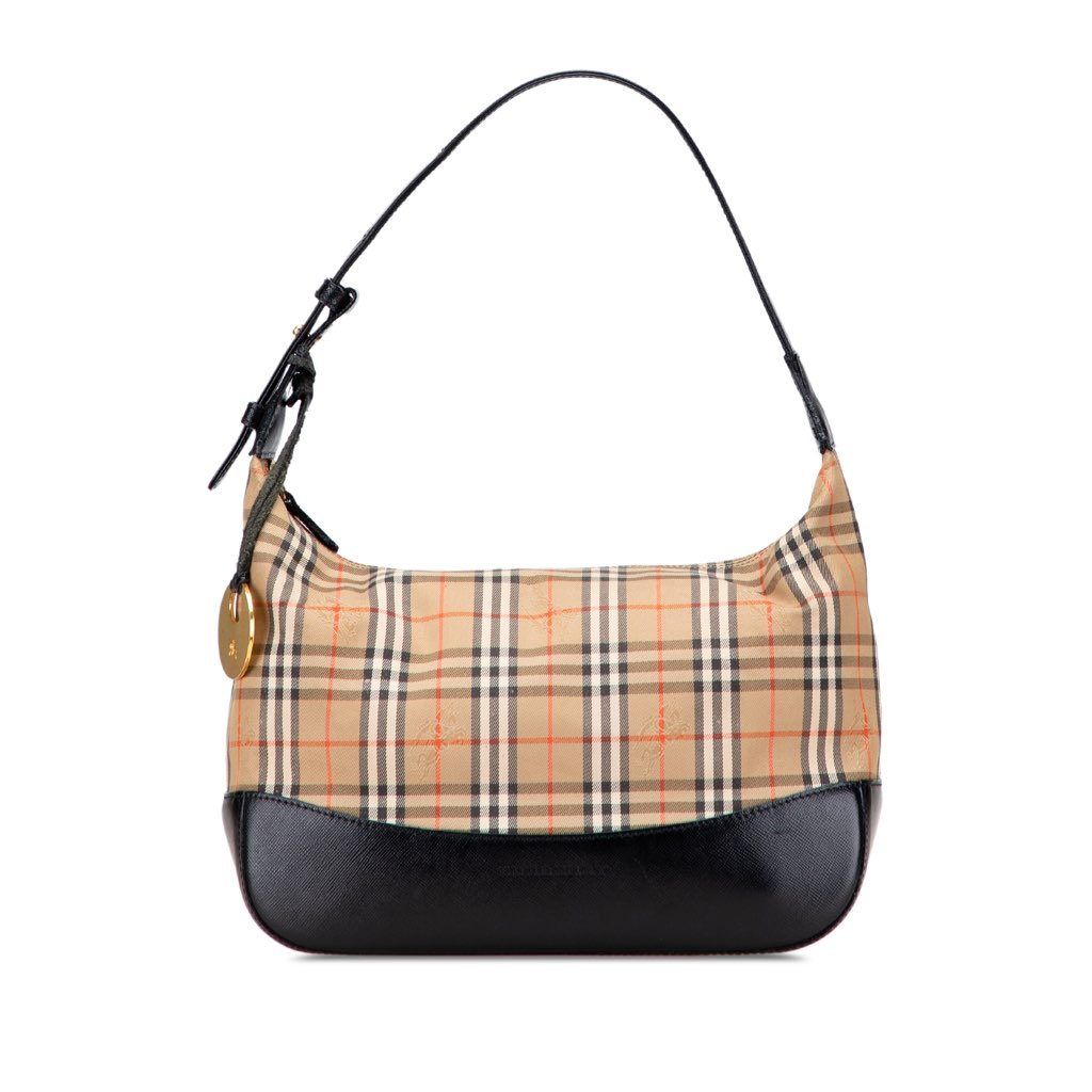 This shoulder bag features a haymarket check canvas body with leather trim, a flat leather shoulder strap, a top zip closure, an exterior zip pocket, and an interior zip pocket.