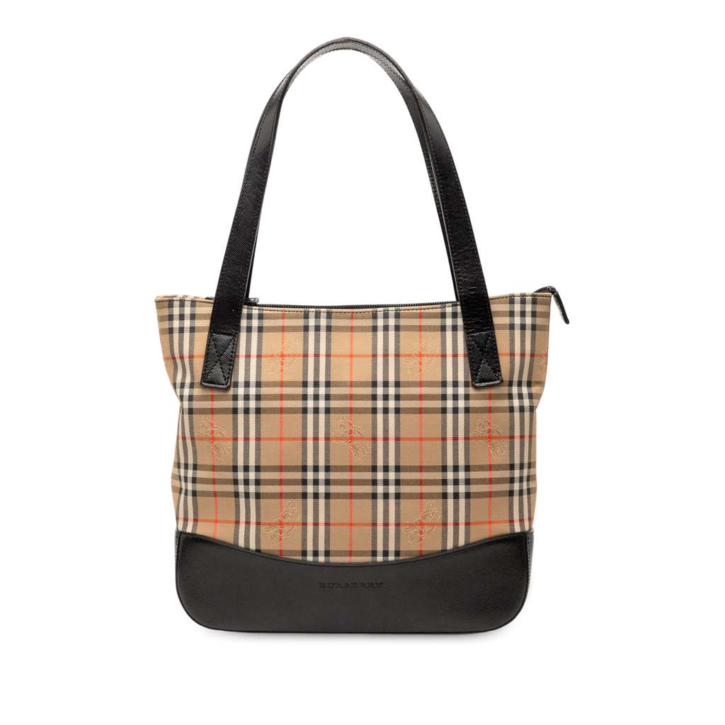 This tote bag features a haymarket check canvas body with leather trim, flat leather straps, a top zip closure, and interior zip and slip pockets.