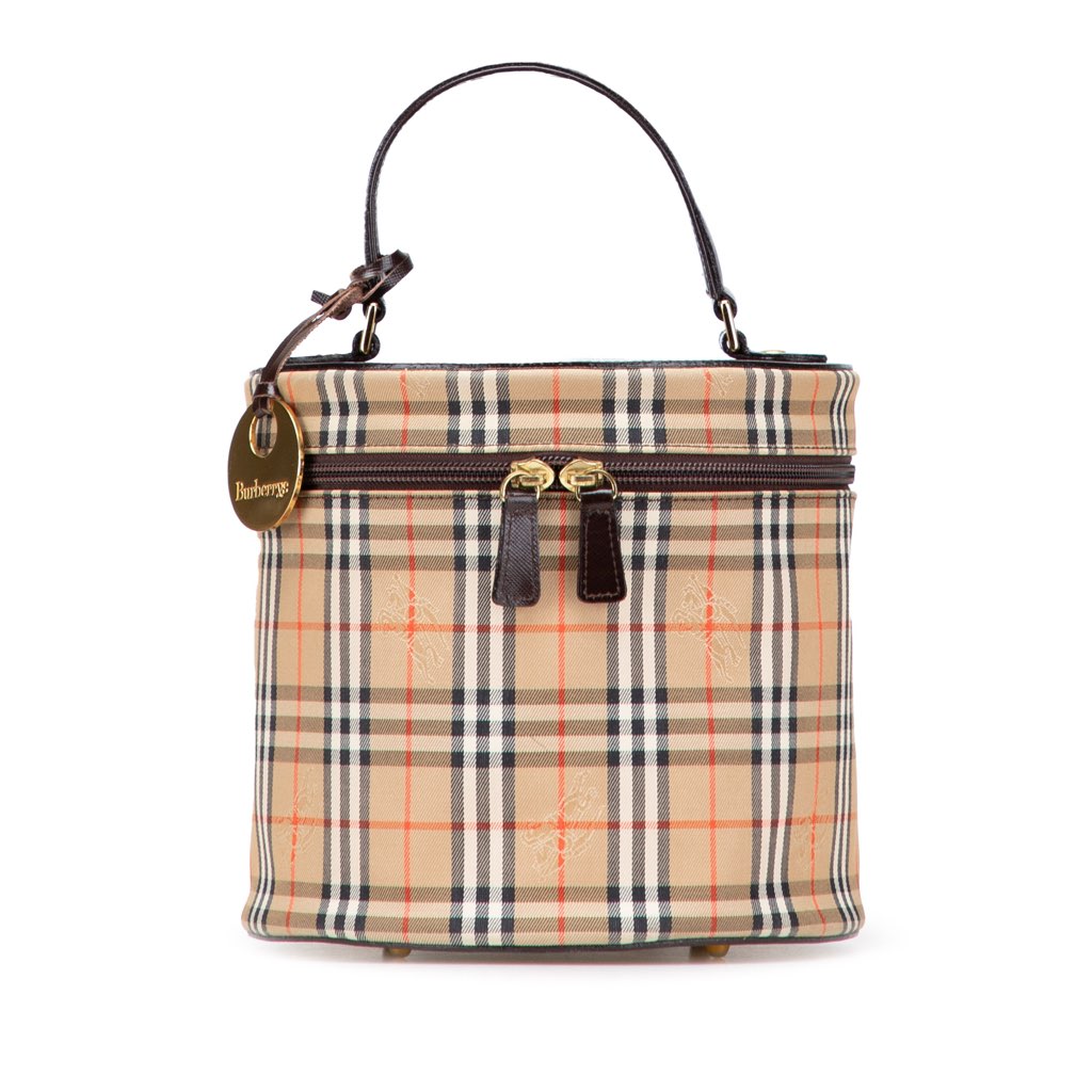 This vanity bag features a haymarket check canvas body with leather trim, a flat leather top handle, a top zip-around closure, and interior zip and slip pockets.
