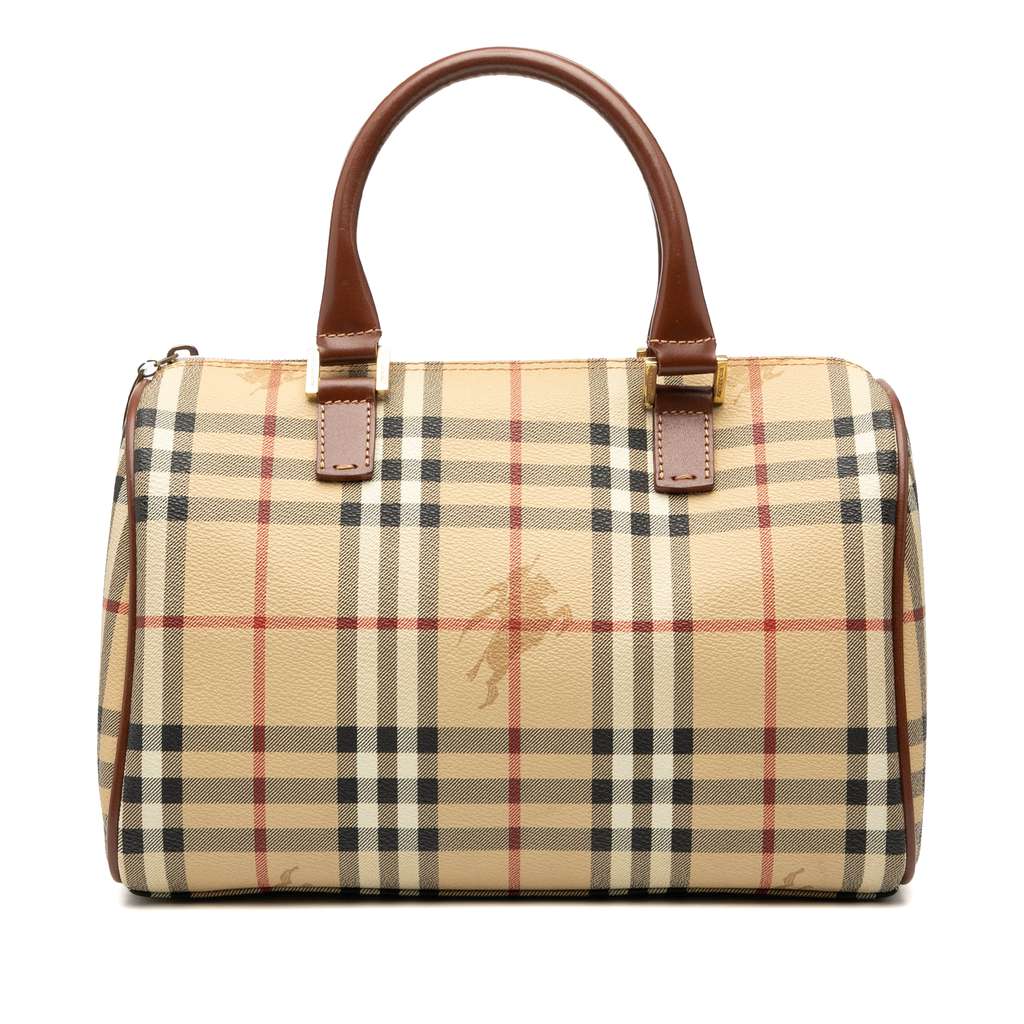 This boston bag features a haymarket check coated canvas body with leather trim, rolled leather top handles, a top zip closure, and an interior slip pocket.