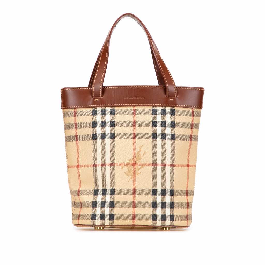 This bucket bag features a haymarket check coated canvas body with leather trim, flat leather straps, an open top, and an interior pocket.