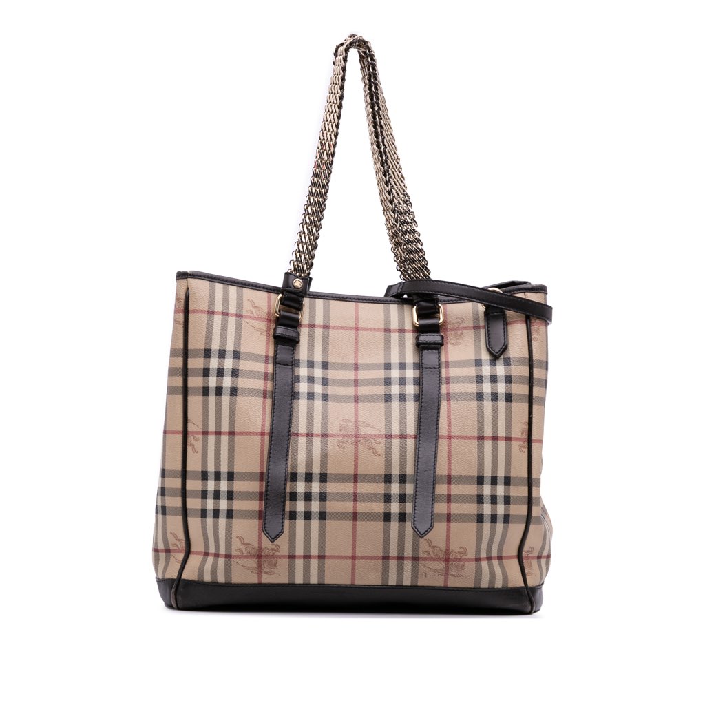 This satchel features a haymarket check coated canvas body with leather trim, chain straps, a detachable flat leather strap, an open top, an interior zip compartment, and interior zip and slip pockets.