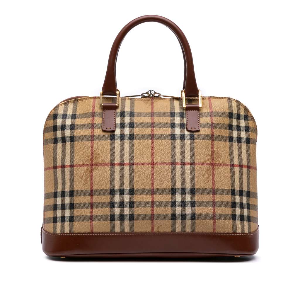 This handbag features a coated canvas body with leather trim, rolled leather top handles, a top zip closure, and an interior zip pocket.