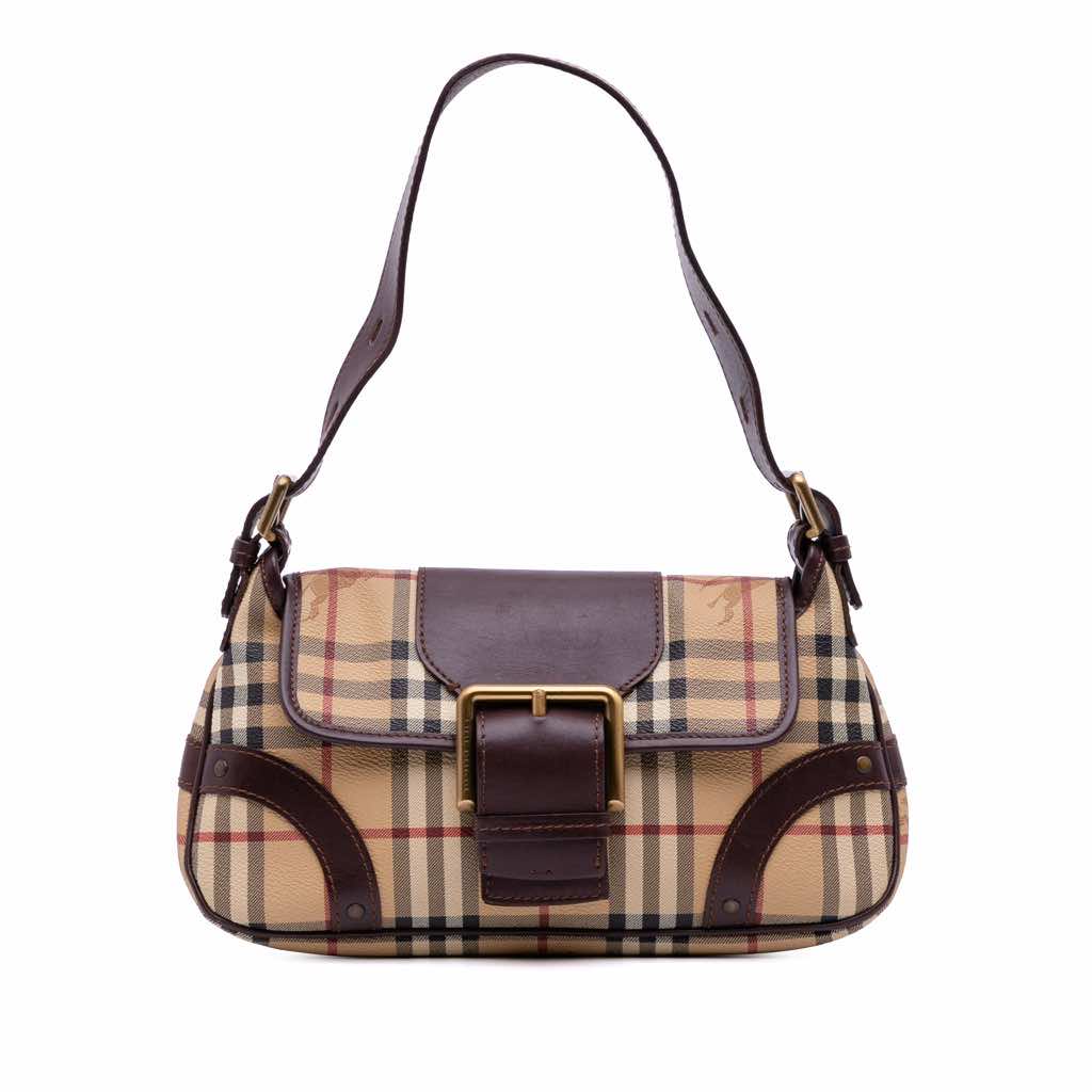 This shoulder bag features a haymarkert check coated canvas body with leather trim, an adjustable flat leather strap, a flap with magnetic snap button closure, and interior zip and slip pockets.