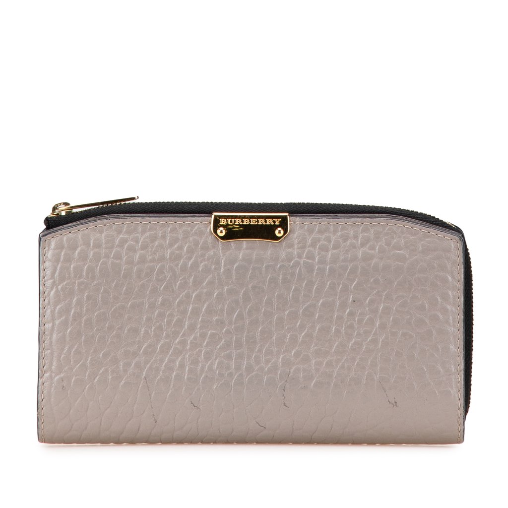 This wallet features a leather body, a top zip around compartment, a snap button closure, and interior slip pockets.