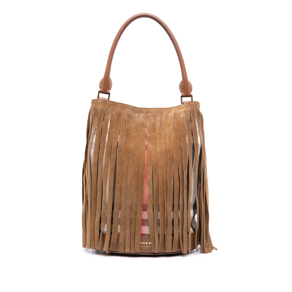 This bucket bag features a house check canvas body with leather trim and suede fringe details, a rolled leather handle, an open top with magnetic snap closure, an interior slip pocket, and a pouch inclusion.