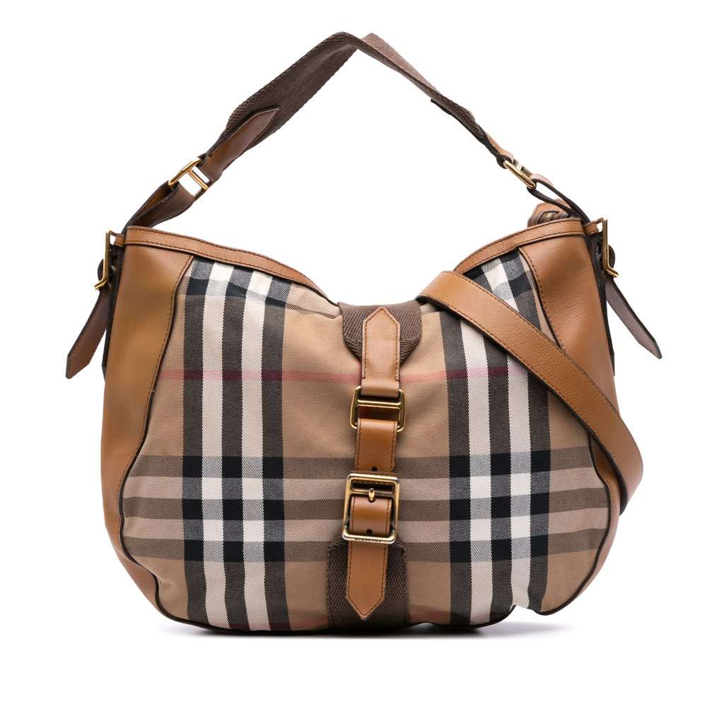 The Ashwood Hobo bag features a house check canvas body with leather trim, a flat leather and canvas handle, a detachable flat leather strap, a top zip closure with a strap and magnetic snap closure, and interior zip and slip pockets.